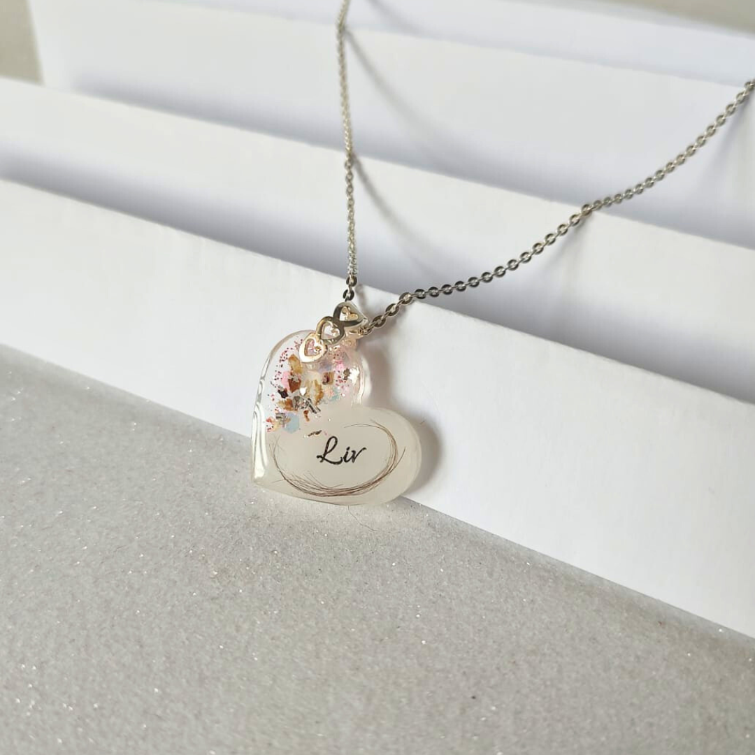 ✨ Feito artesanalmente com leite materno, cabelo e coto umbilical, com elo três corações vazado banhado a prata 925 em alta fusão, cada peça é exclusiva, criada com cuidado para preservar suas memórias. Você também pode adicionar outros elementos de DNA, como dente de leite ou outros itens de valor emocional. E você ainda pode escolher o desenho que deseja fazer com o cabelo e o coto.